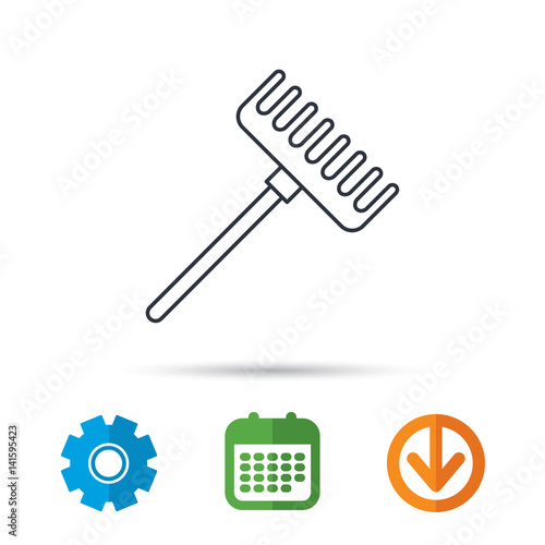 Rake icon. Gardening equipment sign. Outdoor instrument symbol. Calendar, cogwheel and download arrow signs. Colored flat web icons. Vector