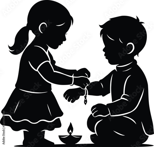Raksha Bandhan festival illustration - Little sister tying Rakhi to brother, silhouette style