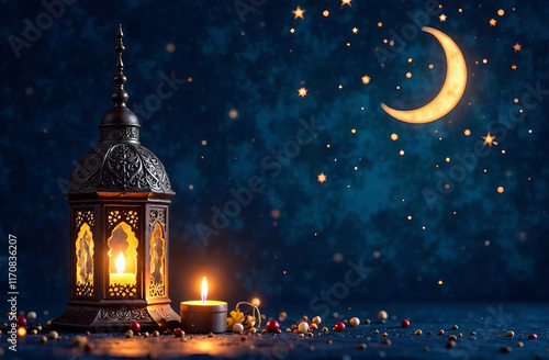 Ramadan background with patterns, flashlight, crescent moon, stars on dark background. Holiday design for the holiday.