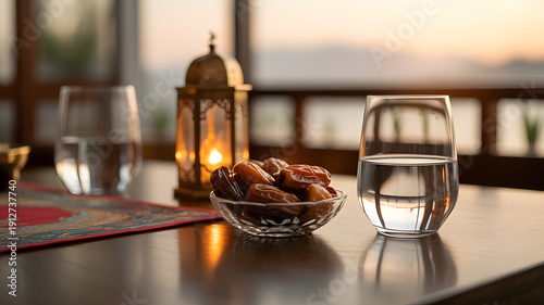 ramadan, date, water, lantern, table, islamic, muslim, fasting, tradition, culture, evening, sunset, celebration, glasses, bowl, gold, light, religious, spirituality, food, drink, still life, indoor, decoration, oriental, dessert, feast, prayer, community, togetherness, faith, middle east, hospitality