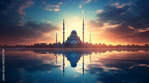 Ramadan Kareem religious background with mosque silhouettes reflected in serene sea, copy space, generative ai