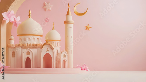 Ramadan Kareem vintage greeting card with islam mosque. Crescent moon, star and muslim minaret retro grunge banner for islam religion holy month holiday celebration design