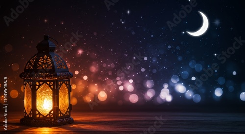 Ramadan lantern glowing under crescent moon in starry night scene