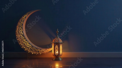 ramadan mubarak design with illuminated crescent moon and arabic lamp 3d render