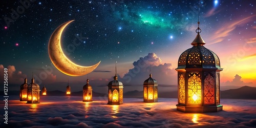 Ramadan Night Sky: Crescent Moon, Lanterns & Stars - Candid Stock Photo