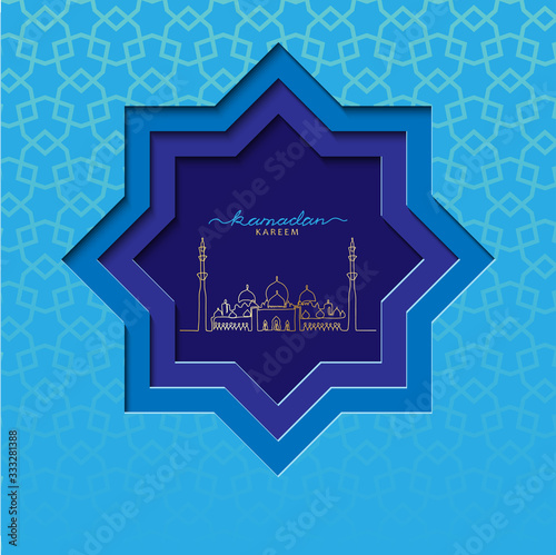 Ramadzan blue square vector card with Grand mosque illustration. Vector papercut card design. Paper cutout decoration for ramazan.