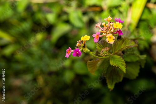 Ramillete de flores de Lantana camara en tonos amarillos, rosas y morados, destacando su belleza multicolor sobre un fondo natural