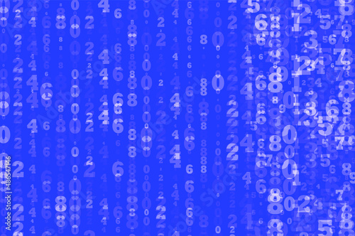 Random numbers 0 - 9. Blue Background in a matrix style. Binary code pattern with digits on screen, falling character. Abstract digital backdrop. Vector