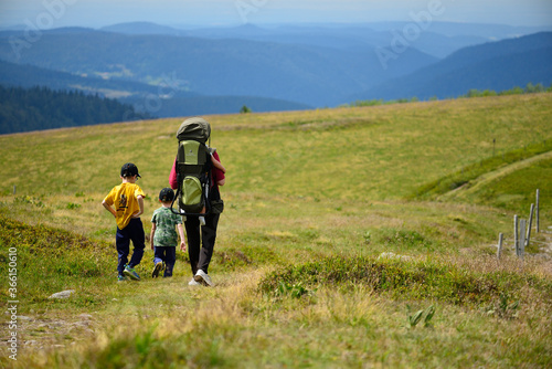 hike, mountain, family, toddler, baby, door, vogesen, cervix, path, meadow, alt, summer, look, clean, nature, walk, people, landscape, travel, heaven, adventure, trekking, backpack, blue, pathway, outside, grass, green, excursionist, hill, route, group, hiker