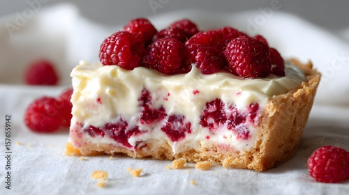 Raspberry cream pie close-up of creamy texture and fresh raspberries.