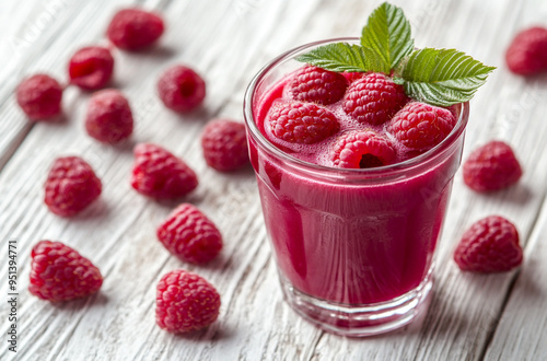 Raspberry juice in a glass with fresh raspberries on a white wooden table