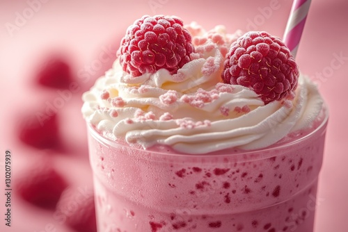 Raspberry milkshake, whipped cream, straw, pink background, dessert