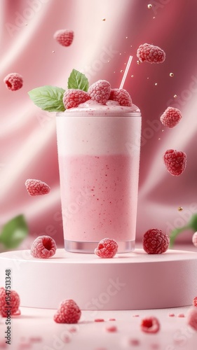 Raspberry smoothie on a rainbow podium with a shimmering curtain.
