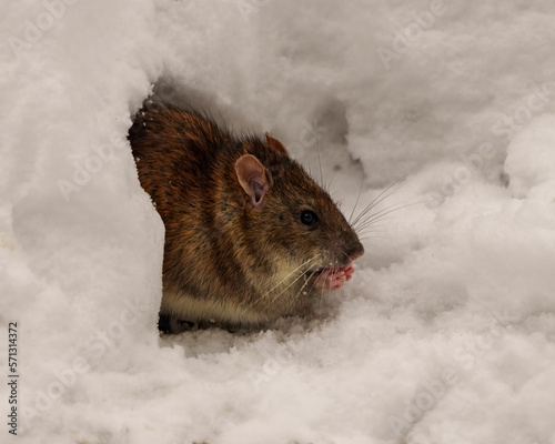 Rat Stock Photo and Image. Brown rat head close-up in the opening of its burrow den in winter season foraging for food in its environment and habitat surrounding.