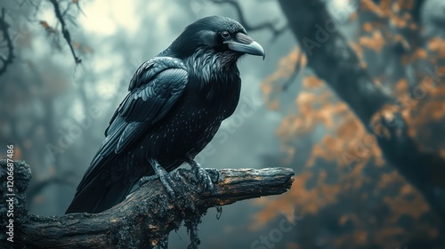 Raven on a Misty Autumn Branch: A Dark and Atmospheric Wildlife Image