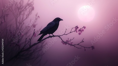 raven, bird, tree branch, dawn, mist, tree, pink, moon, nature, wildlife, crow, animal, sky, fog, blossom, spring, sunrise, silhouette, dark, beauty, mystical, serene, peaceful, calm, quiet, tranquil, magical, mysterious, aethereal, romantic, delicate, elegant, vibrant, soft, gentle, subtile, moody, atmospheric, dreamy, solitude, lonely, hope, freedom