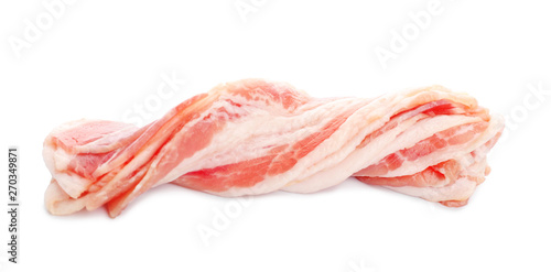 Raw bacon strips on white background