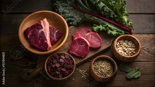 Raw Beef Cuts with Kale, Legumes, and Seeds on Rustic Wooden Background