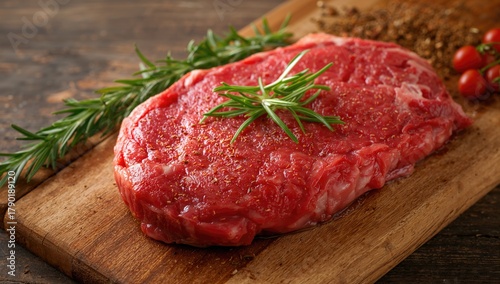Raw beef steak seasoned with rosemary and spices on a wooden surface, protein-rich meal