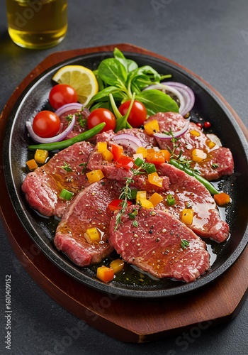 Raw Beef Steak with Cherry Tomatoes Lemon Slices Fresh Herbs and Vegetables on Black Plate