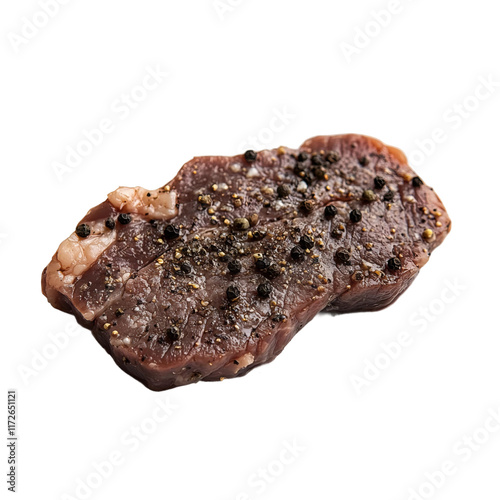 raw, meat, pepper, seasoning, food, protein, ingredient, cooking, butcher, fresh, red meat, uncooked, diet, nourishment, healthy, epicure, culinary, isolated, white background, studio shot, still life, closeup, macro