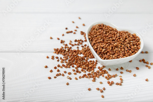 Raw buckwheat in a bowl on a textured wooden background. Wheat grains, porridge, cereals, raw buckwheat in a plate. Healthy food. Porridge. Diet. Organic cerea. Space for text.Copy space.