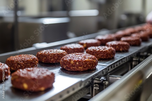 burger, patty, meat, food, processing, plant, factory, production, manufacturing, conveyer, belt, line, assembly, industrial, technology, machinery, equipment, automation, food industry, raw, uncooked, ingredient, preparation, cooking, eatery, fast food, hamburger, beef, ground beef, mass production, efficiency, quality control, hygiene, safety, sanitation, stainless steel, metal, culinary, process, modern, efficient