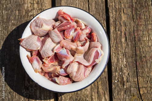 Raw chicken gizzards in metal enamelled bowl on rustic wooden table