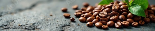 Raw coffee beans on a stone surface with a few leaves, natural texture, stone