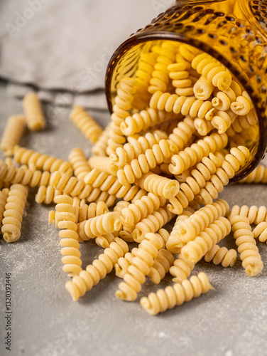 Raw dry fusilli bucati pasta in the glass. Selective focus.