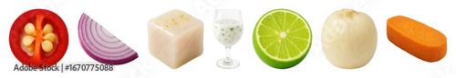 Raw food ingredients set including red chili, red onion, white fish, lime, white onion, carrot, and sauce glass isolated. Healthy cooking collection.