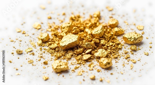 Raw Gold Nuggets and Dust Scattered on White Surface