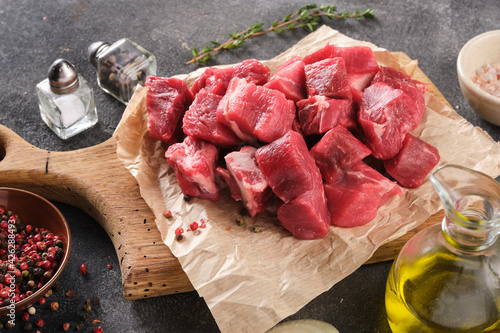 Raw ingredients for goulash. Fresh raw chopped beef on an wooden board, spices, herbs and vegetables on dark grey background