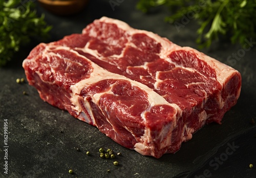 beef, steak, raw, marbled, meat, red, food, cooking, butcher, cookery, delicious, grilled, protein, receipe, dinner, lunch, epicure, eatery, fresh, organic, healthy, diet, nourishment, high-quality, closeup, detail, texture, dark, background, stone, slab, pepper, herb, greenery, ingredient, rich, juicy, butchering
