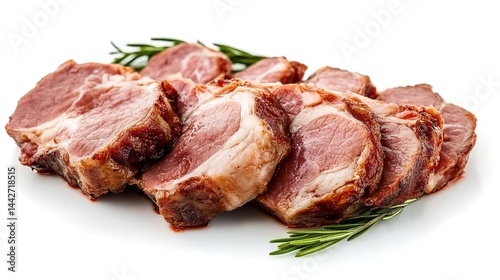 Raw meat slices with rosemary sprig on white background.