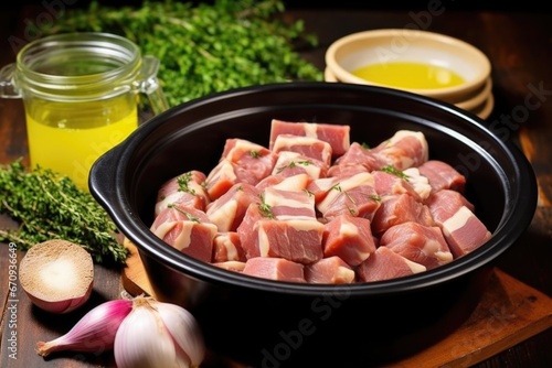 raw pork belly slices placed in a ceramic bowl with marinade