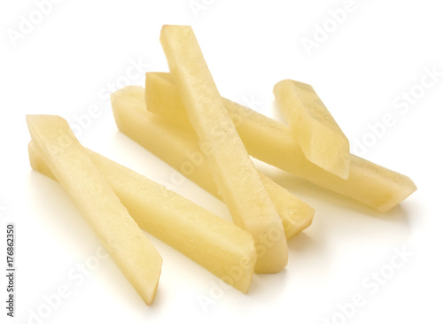 Raw Potato sliced strips prepared for French fries isolated on white background