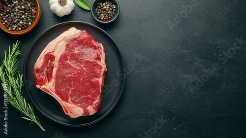 ribeye, steak, raw, meat, herb, rosemary, garlic, peppercorn, plate, rustic, food, culinary, epicure, dark background, fresh, cooking, protein, beef, ingredient, kitchen, seasoning, butcher, texture, receipe, dining, cookery, favor, appetising, professional, food photography, preparation, dark, minimalistic, vibrant, delicious, high-quality, classic, premium, grill, bar-b-q, nourishment