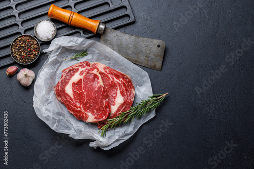 Raw ribeye steaks with savory spices