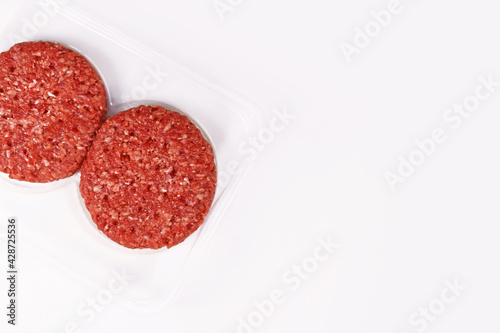 Raw round burger patties in package on white background with copy space