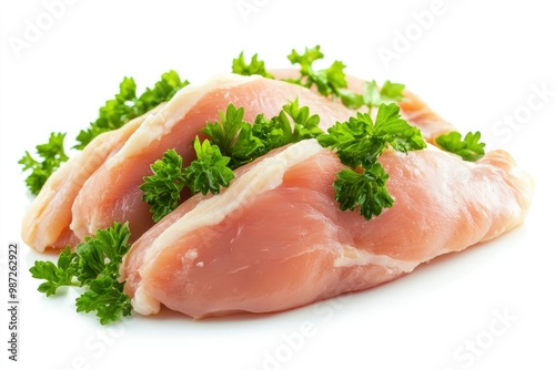 Raw skinless and boneless chicken breast meat with parsley garnish isolated on white , ai