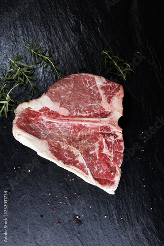 Raw T-bone steak on stone cutting board.