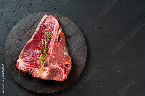 Raw t-bone steak with rosemary, pepper. Prepared for cooking. Close up.