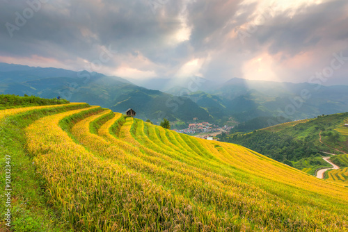Ray of light and Beautiful nature rice fields on terraced of Vietnam. Rice fields prepare the harvest at Northwest Vietnam.Vietnam landscapes.