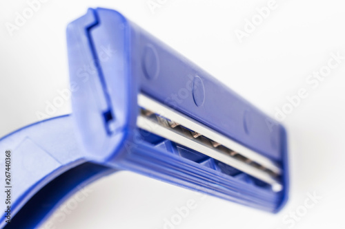 Razor close-up on a light background. Means of hygiene, shaving, removing excess hair. Hygienic procedure.