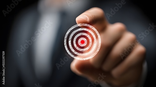bullseye, red, sharpened, success, achievement, goal, businessman, hand, pointing, touch, virtual, screen, digital, technology, strategy, marketing, business, corporate, professional, career, leadership, management, solution, concept, idea, illustration, vision, motivation, challenge, direction, choice, aim, accurate, precise, determination, confident, suit, attaching, dark, serious, closeup, macro, performance, result, competition, improvement, development, reaching