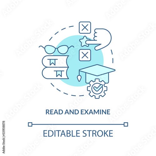 Read and examine turquoise concept icon. Analyzing facts. Structure of case study abstract idea thin line illustration. Isolated outline drawing. Editable stroke. Arial, Myriad Pro-Bold fonts used