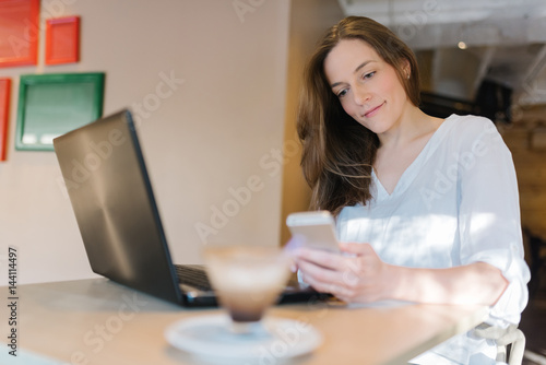 coffee cup, cafes, hot drink, well-dressed, modern, groomed, fashionable, confident, comfortable, brunette, beautiful, missy, sunny, indoor, business plan, mobile phone, mail, scrolling, laptop, copywriter, freelancer, working, smiling, sweet, motivated, texting, chatting, copy space