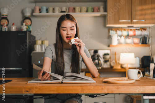 Reading book while enjoying snack, young woman sits at wooden table in cozy kitchen. warm lighting and stylish decor create relaxed atmosphere, perfect for unwinding