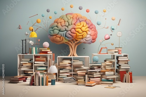 Reading books makes your brain grow and gain knowledge. Illustration, education collage.
